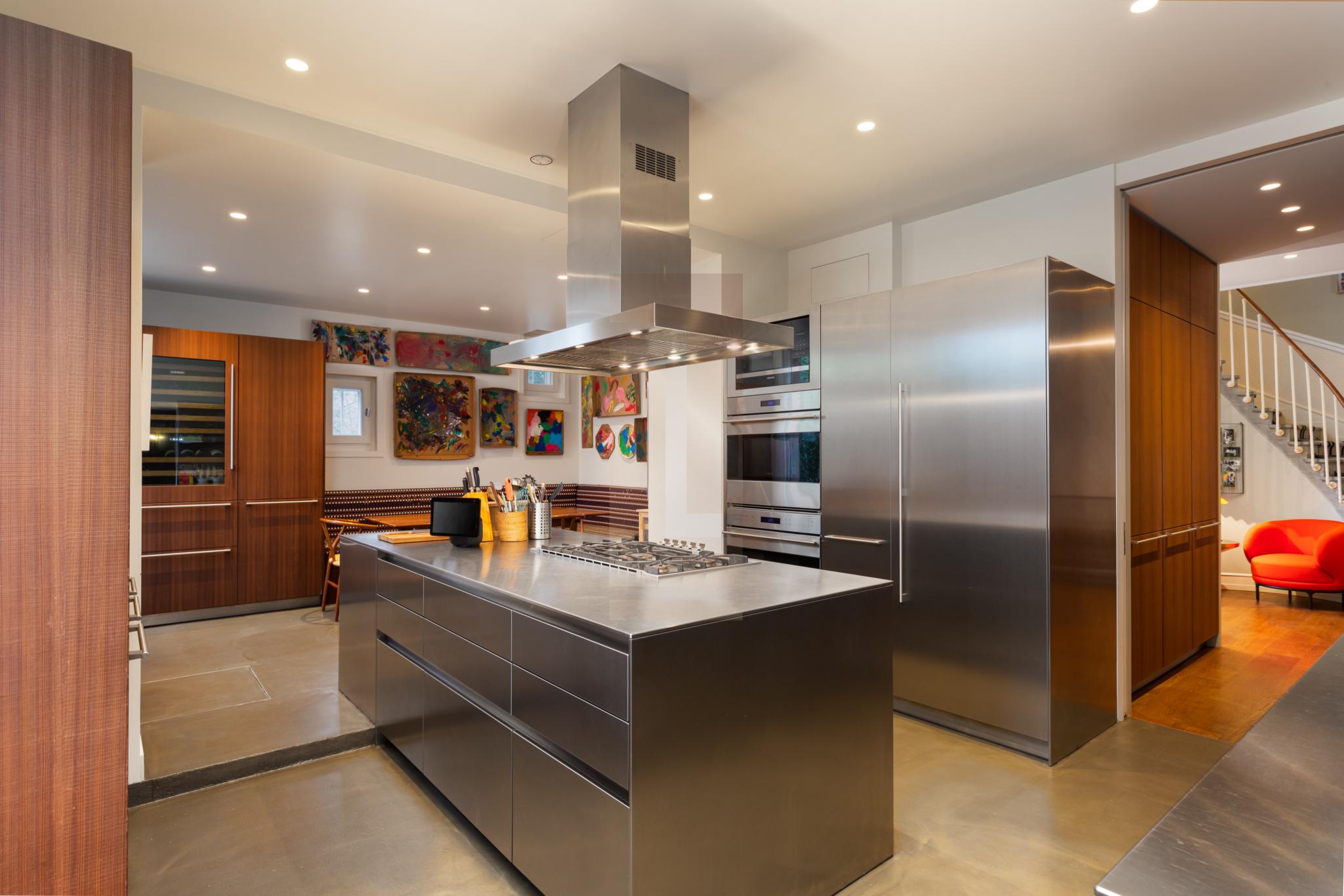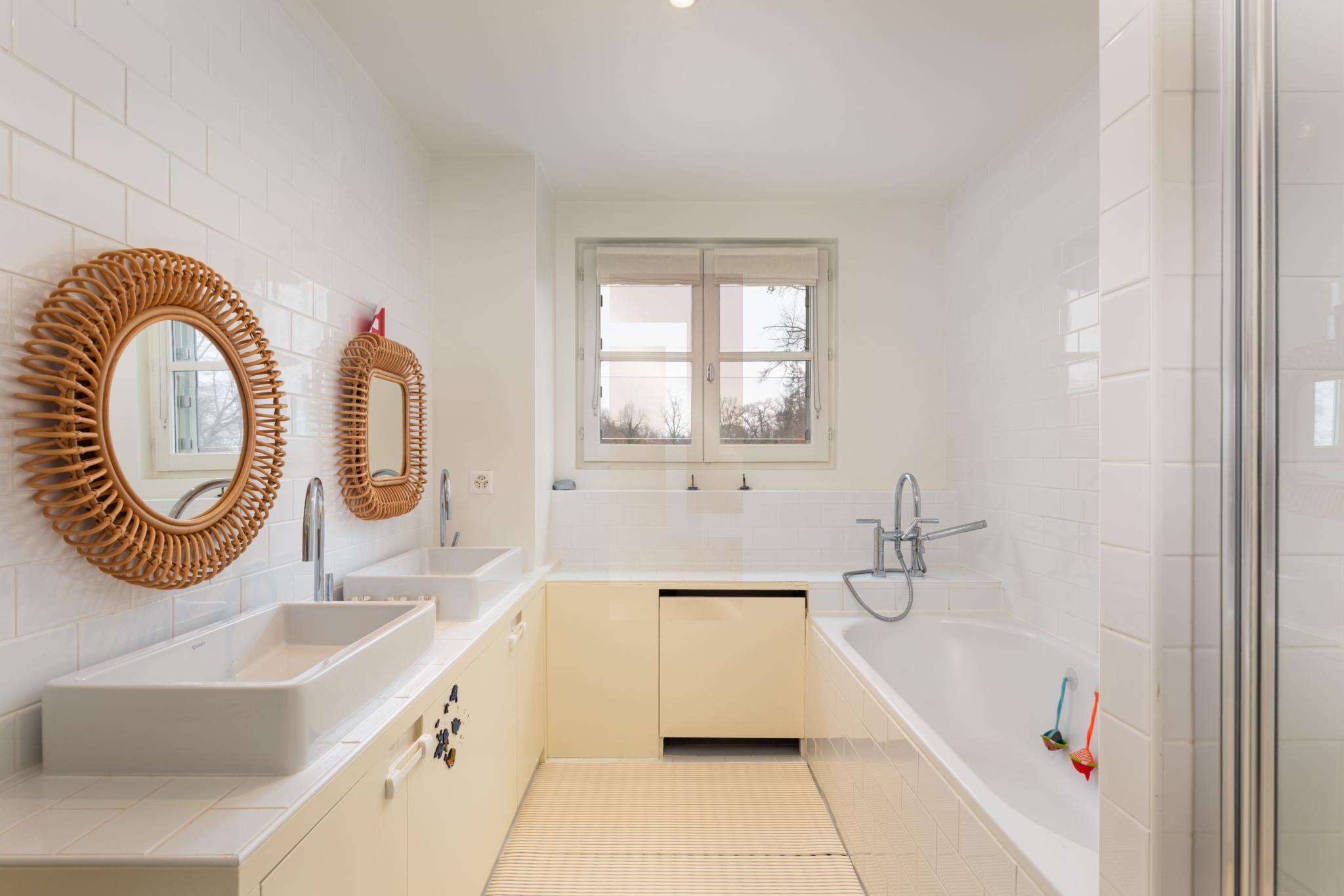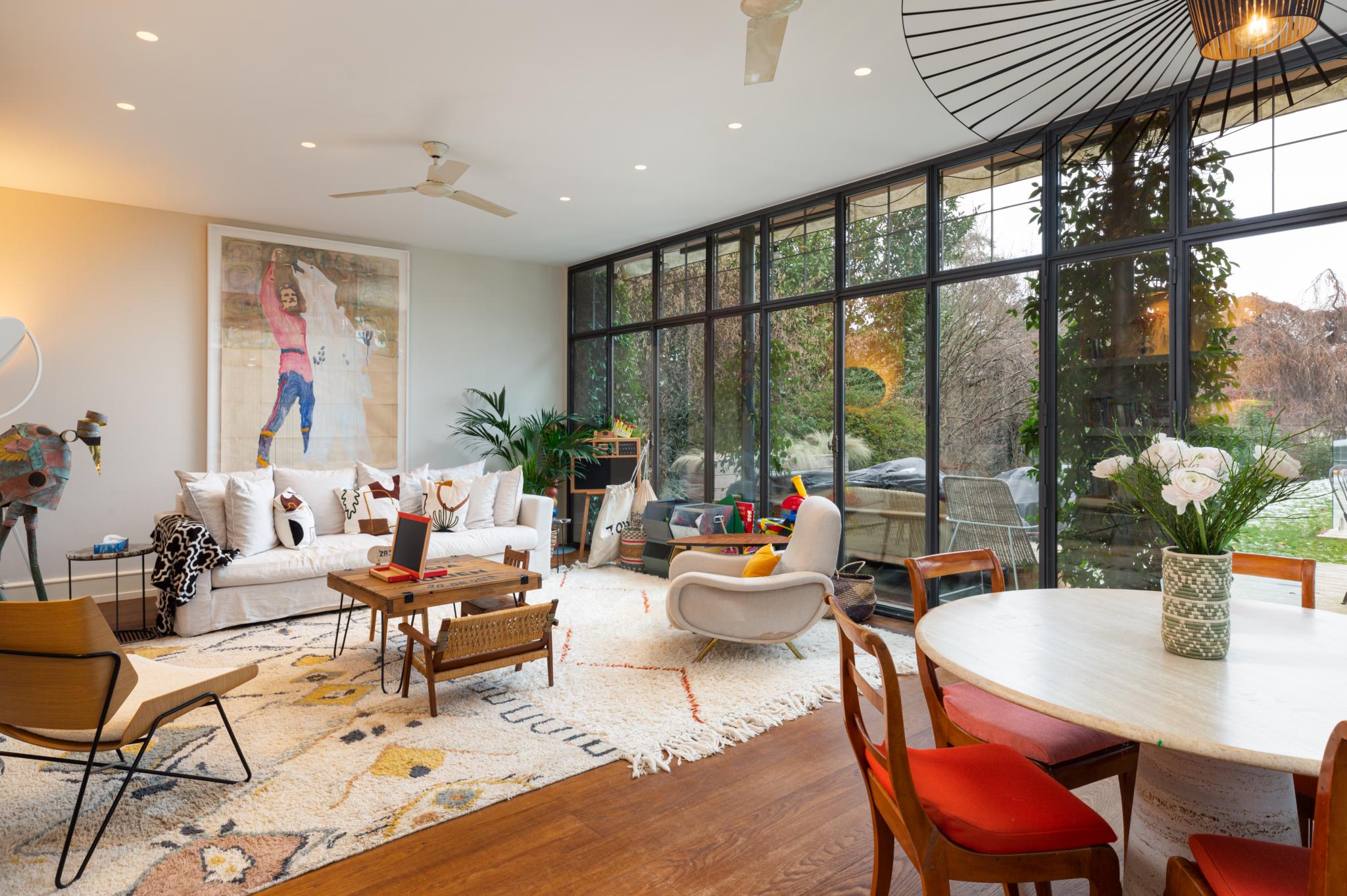 The ground floor is bright and spacious, featuring two living rooms, one with a fireplace, a dining room, and a modern kitchen equipped with high-end appliances. Large windows and the magnificent glass roof bring ample light into every room, creating a warm and welcoming atmosphere.