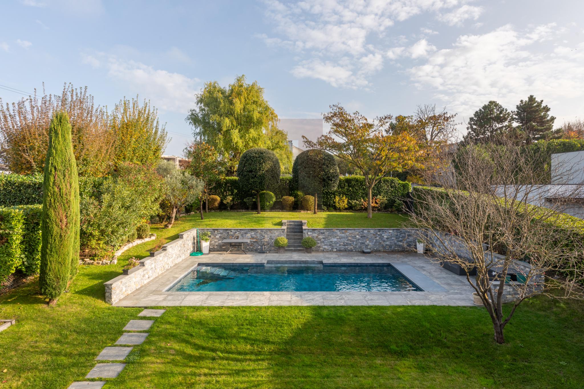 Le jardin, magnifiquement arboré, est agrémenté d’une piscine. Un garage fermé avec portes automatiques, permettant de stationner deux voitures, complète cette propriété d'exception.
